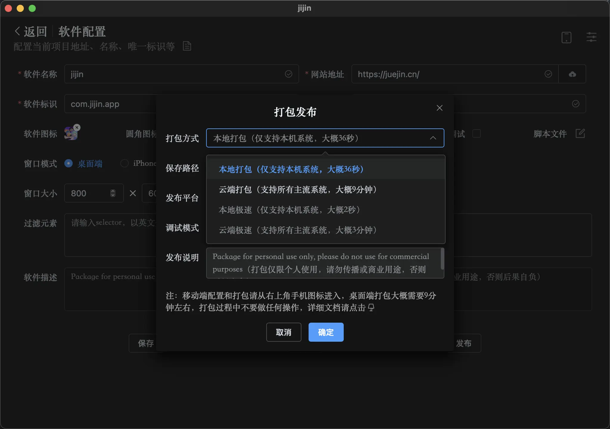 本地发布模式支持在本地不联网的情况下打包发布,并且也不用安装任何环境,而且打包时间仅需 30 秒左右,不受文件大小和数量限制,也不受打包时间限制,但是并不推荐正式使用,因为本地打包不支持单例模式,不支持窗口状态保持,体积也要比云端打包大,仅支持 Windowsx64 和 mac 端本地打包,而且并不稳定,优先推荐使用云端打包。